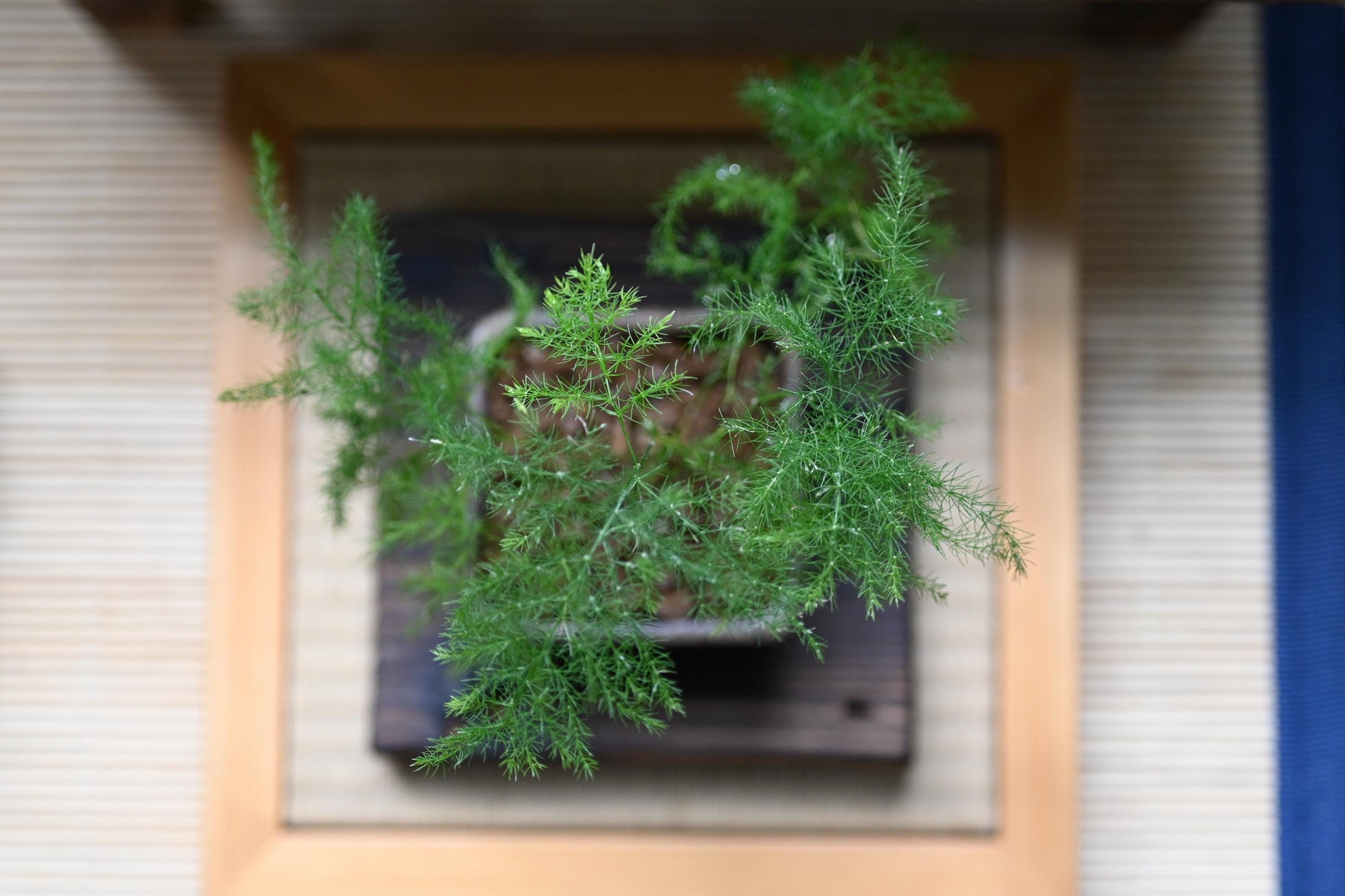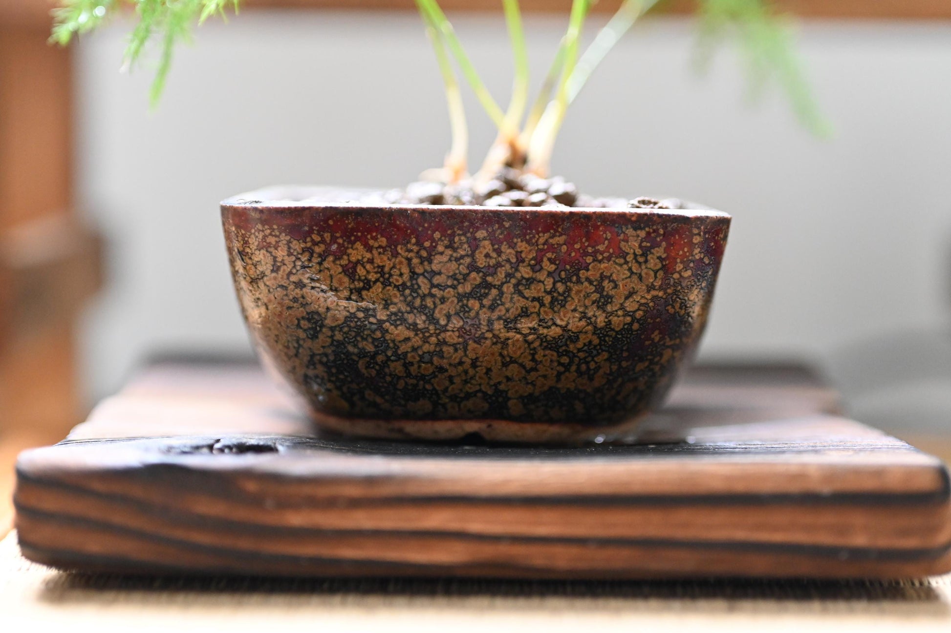 Mini Asparagus fern bonsai in handmade ceramic pot from Miyazaki with a care guide