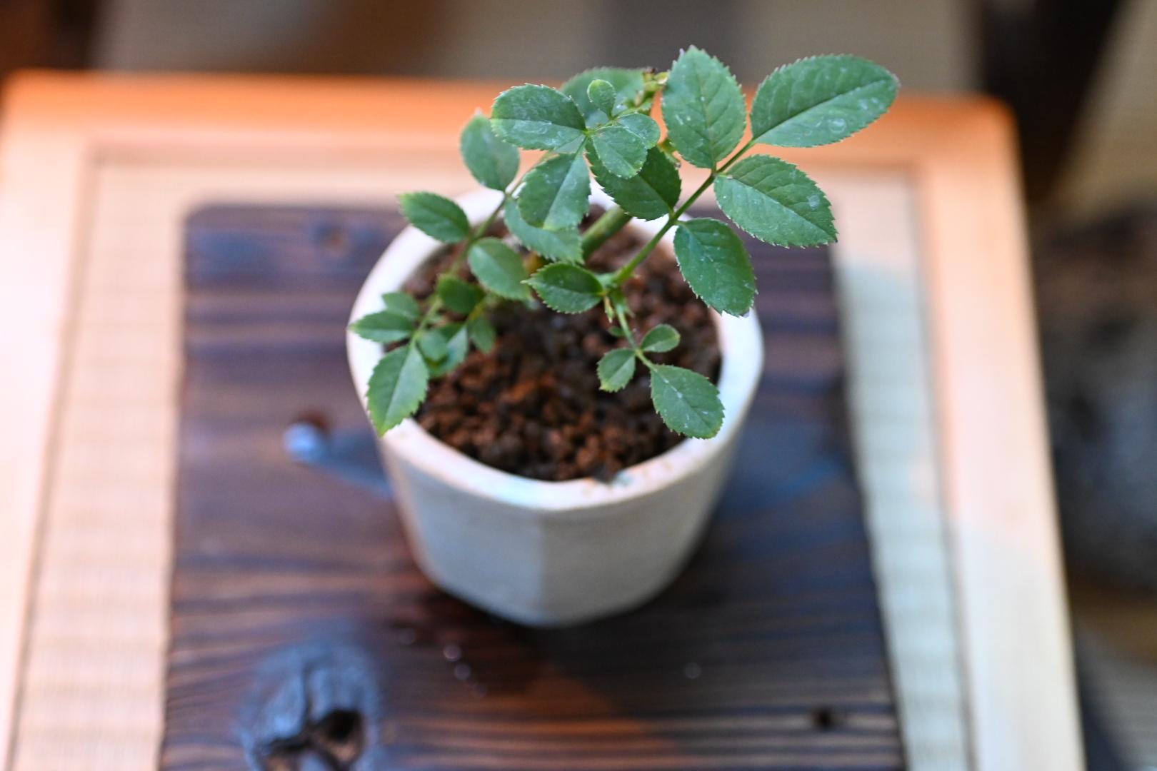 Mini rose bosai in a handmade ceramic pot from Miyazaki, Japan